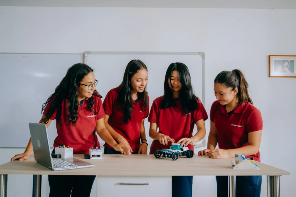 Aulas totalmente equipadas con pantallas digitales, proyectores, audio y video de alta calidad, con puntos de red en cada aula para el acceso a internet ultrarrápido. En este ambiente se desarrolla la Robótica Educativa que nos permite potenciar el razonamiento y la creatividad de nuestros estudiantes.